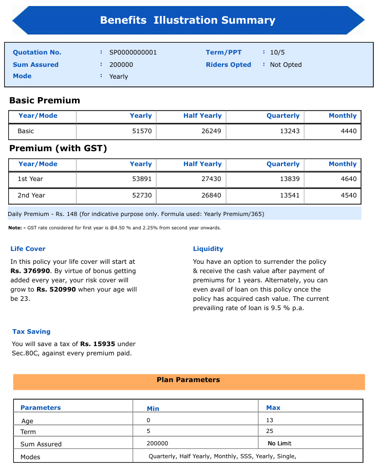 • Tax Benefits: Tax deduction under Section 80C for premiums paid. | Tax exemption under Section 10(10D) for maturity and death benefits.