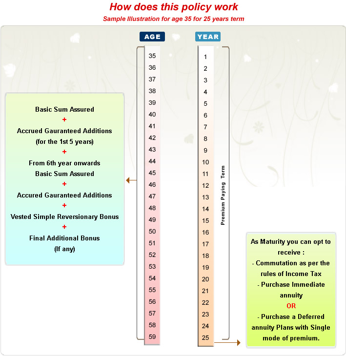 Provided the policy is in full force, Basic Sum Assured along with accrued Guaranteed Addition, Vested Simple Reversionary Bonuses and Final Additional Bonus, if any,shall be paid as lump sum or in the form of an annuity or partly in lump sum and balance in the form of an annuity to the nominee/legal heir at the then prevailing immediate annuity rates.